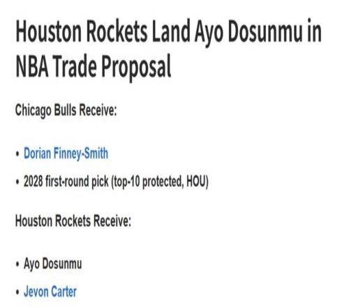 公牛得到:芬尼史密斯+28年火箭首轮签(前十保护)。