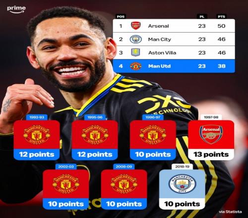 据媒体统计,英超历史上7次有球队在落后积分10+情况下最终逆转夺冠,其中5次是曼联做到。