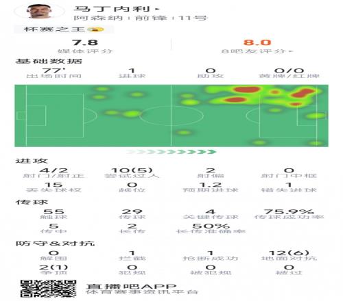 体育播报1月29日宣 在本轮欧冠阿森纳对阵阿拉木图凯拉特,马丁内利破门,以下为他在本场数据: