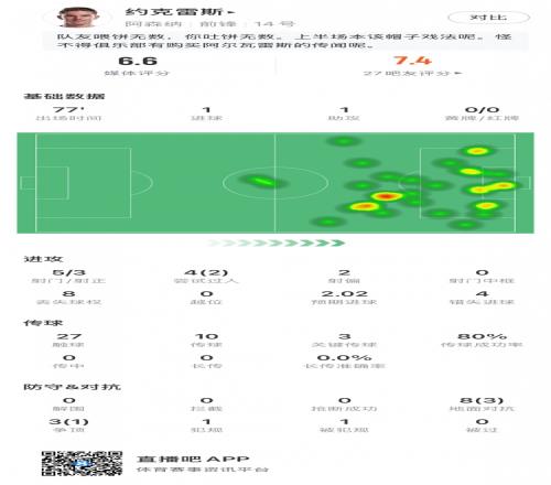 体育播报1月29日宣 欧冠联赛阶段第8轮,阿森纳主场对阵阿拉木图凯拉特,约克雷斯代表阿森纳首发出战,在第77分钟被替换下场,球员本场数据如下: