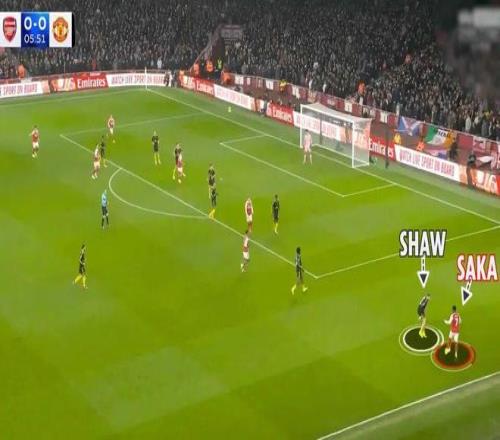 多古打边锋的一大优势,是他在防守中也有贡献,回撤形成双保险,让卢克·肖可以放心在外侧一对一防守萨卡。
