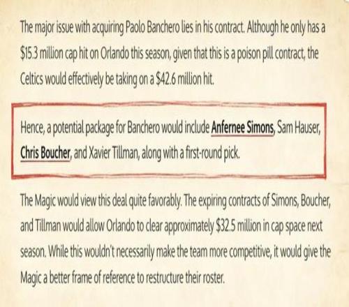 据美记Brian Windhorst报道,魔术中锋班切罗是凯尔特人的头号引援目标,为了引入这位全明星中锋,他们愿意给出的报价为:小西蒙斯、豪瑟、布歇、蒂尔曼以及一个首轮签。