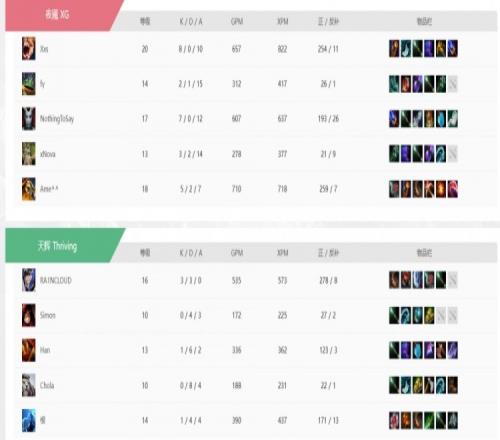 22分钟XG拿下一代肉山!Ame小骷髅带盾!25分钟XG先破上路高地再转中,正面Thriving交出露娜+术士大招效果一般,没人管的Xxs獣已经直接冲散了Thriving的后排!Thriving敲出GG!XG轻松晋级胜者组第二轮!